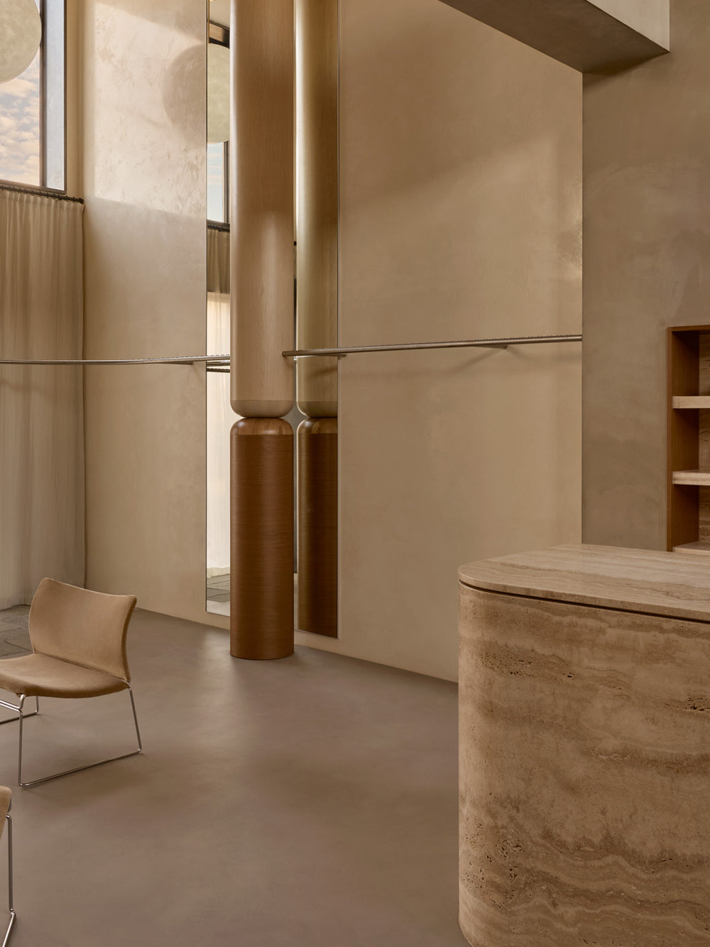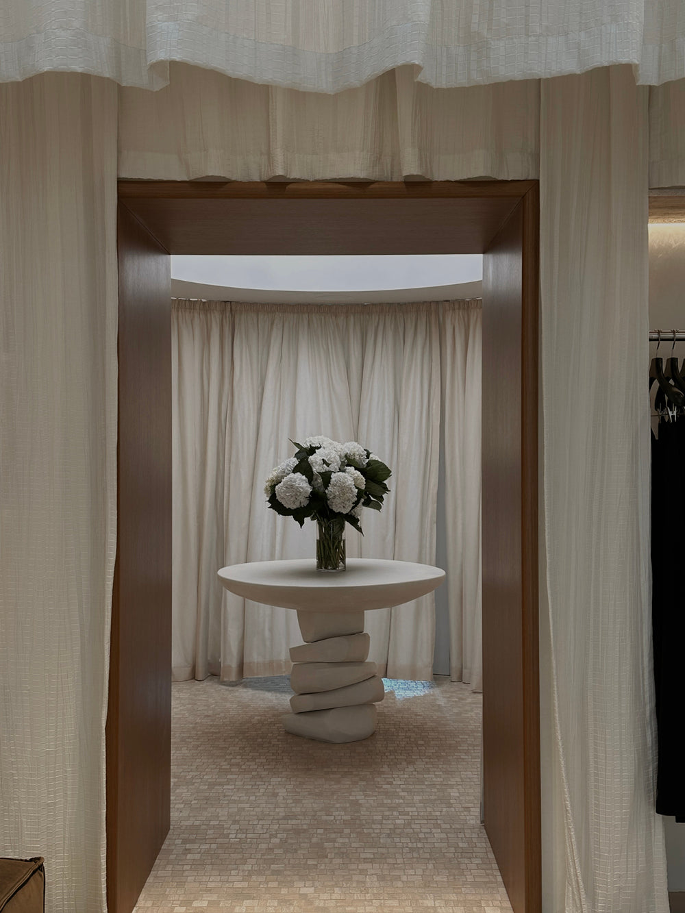 Like all our stores before it, High Street features our signature travertine counter along with a few fresh additions: chunking shelving and travertine mosaic flooring of the fitting room foyer. A masterpiece that deserves all your attention, but admittedly might fall in at a close second behind the room’s custom centrepiece table by Melbourne-based furniture and art studio, Den Holm.Â
