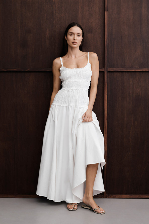 - Tiered elasticated gathering featuring easy fitting shirring through body