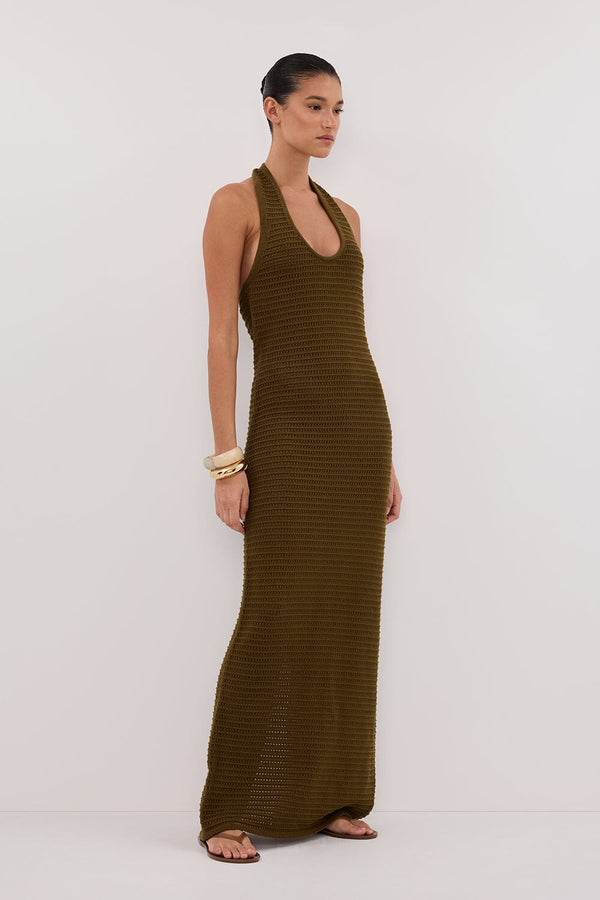 GINA OLIVE HALTER CROCHET DRESS