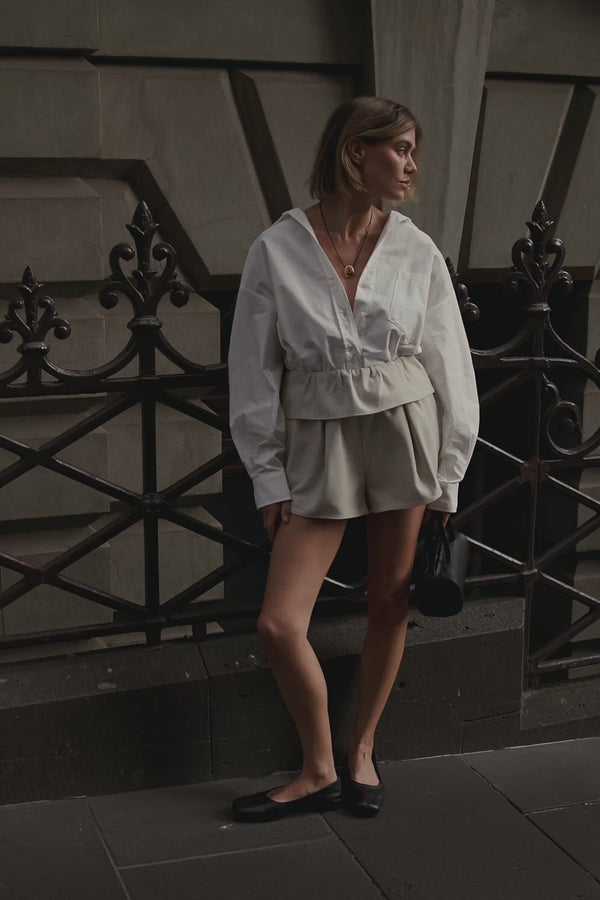- Voluminous tucks through waistband