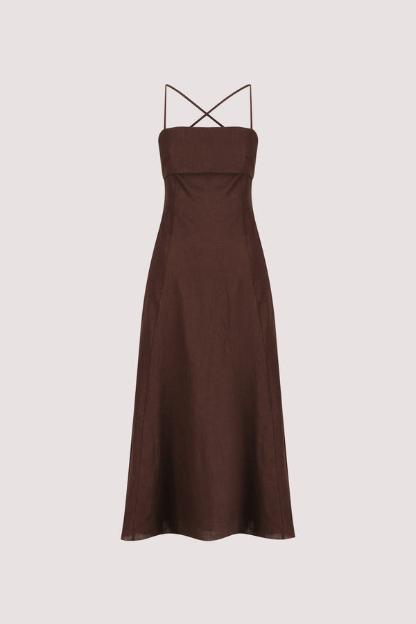 DANIELLA COCOA LINEN TIE BACK MIDI DRESS