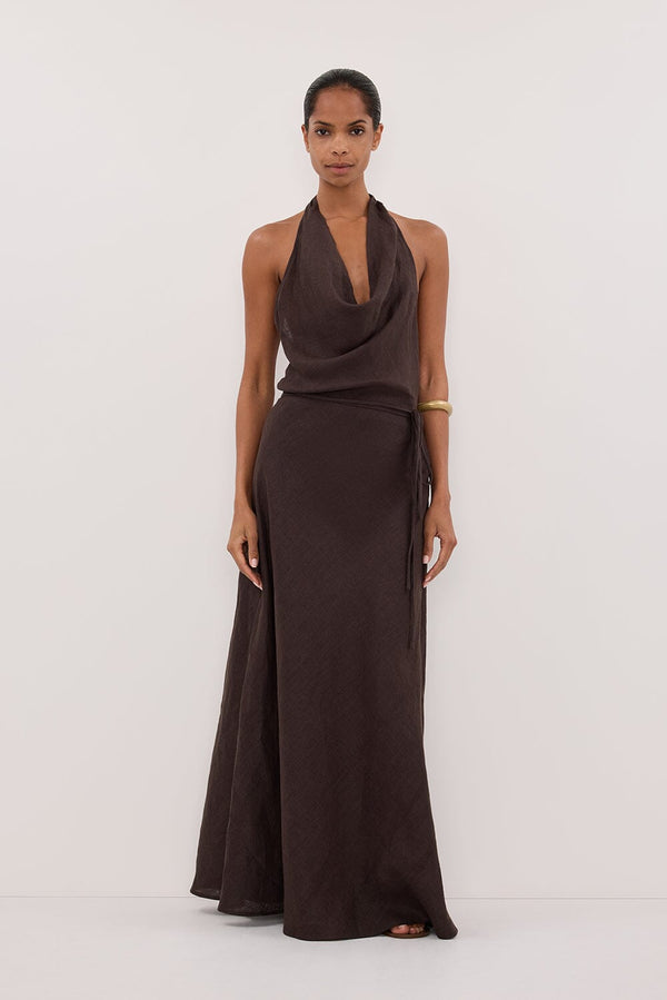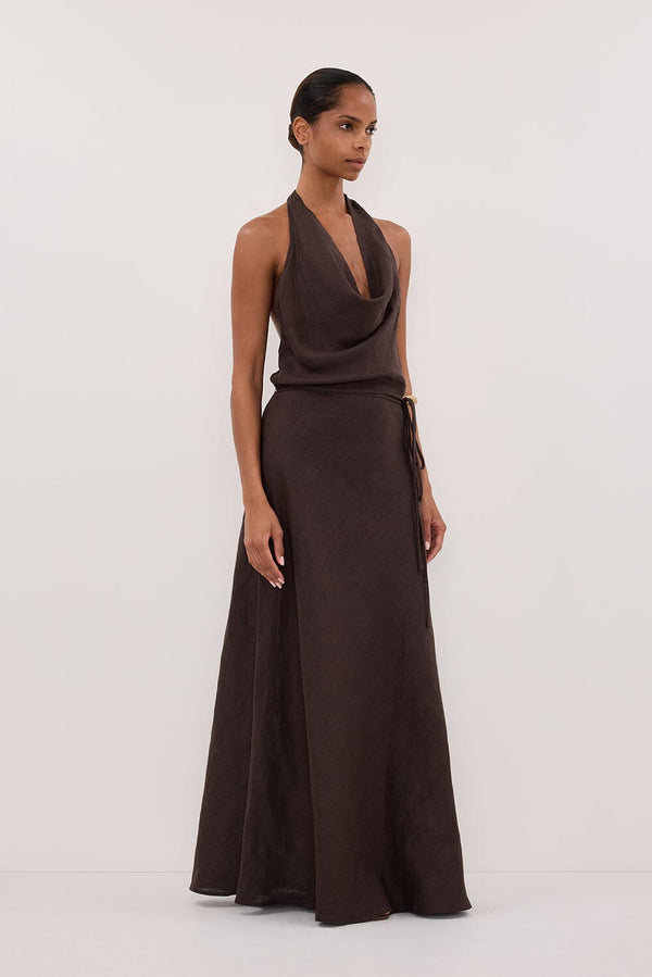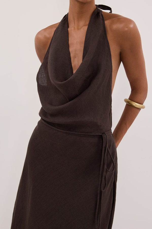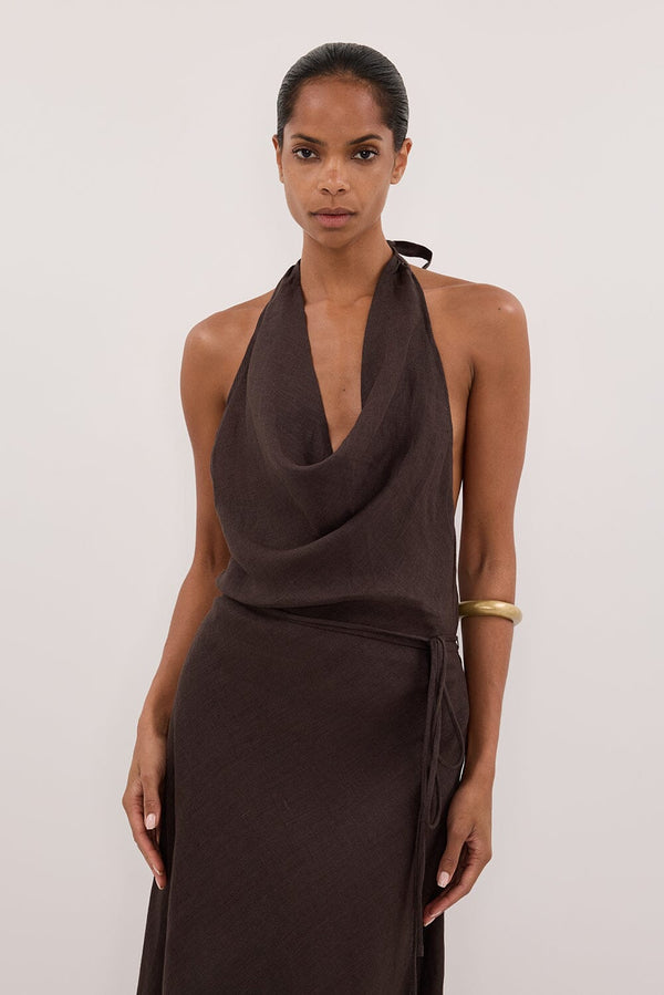 HAYLEE BURNT CHOC SLEEVELESS LINEN COWL DRESS - PRE ORDER