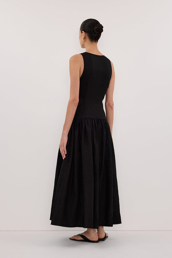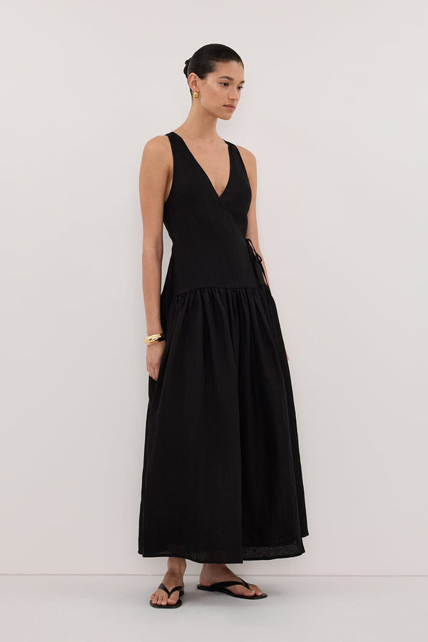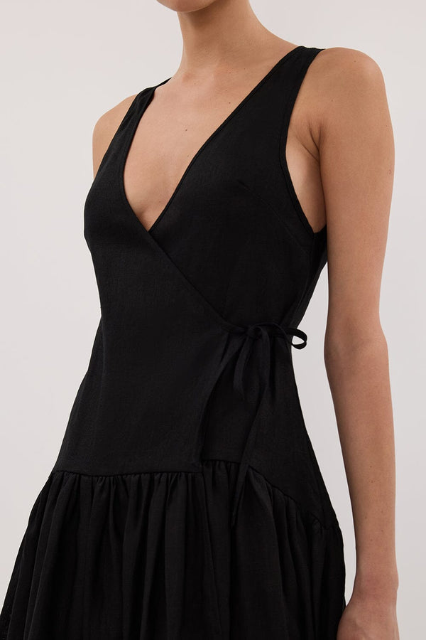 ILIO BLACK SLEEVELESS LINEN WRAP MIDI DRESS