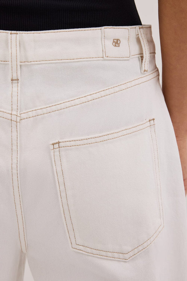 - Mid rise white denim barrel leg jean
