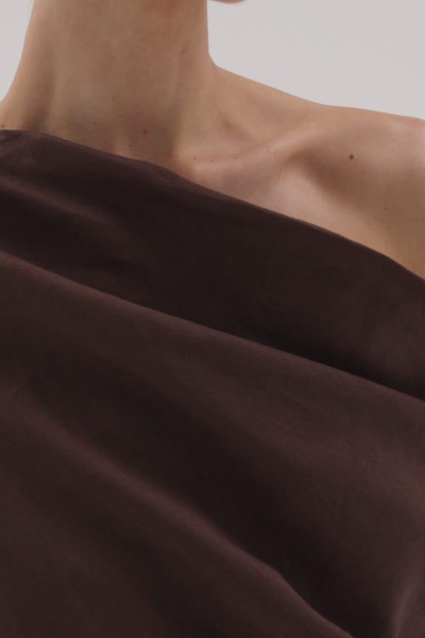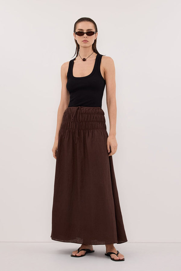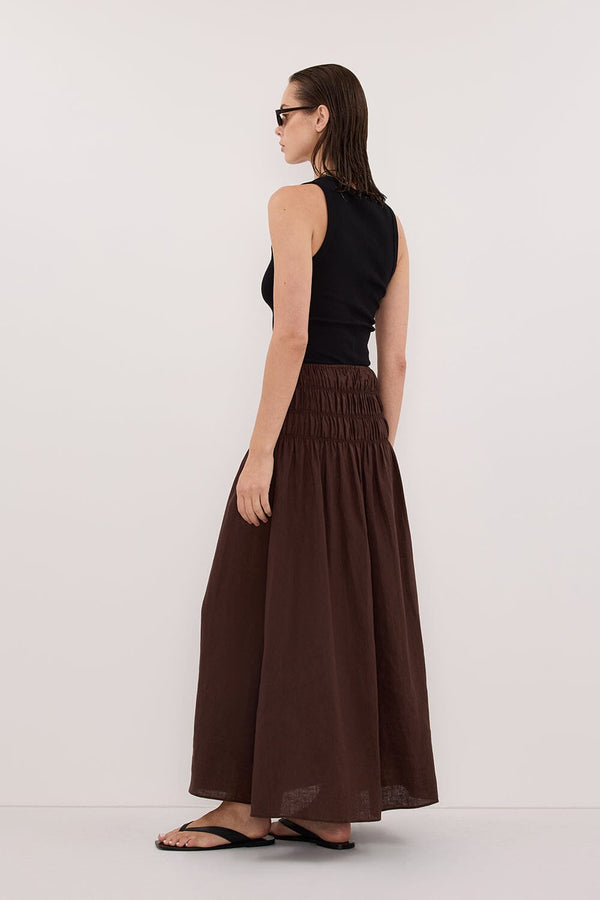 MAIA COCOA LINEN SHIRRED MIDI SKIRT