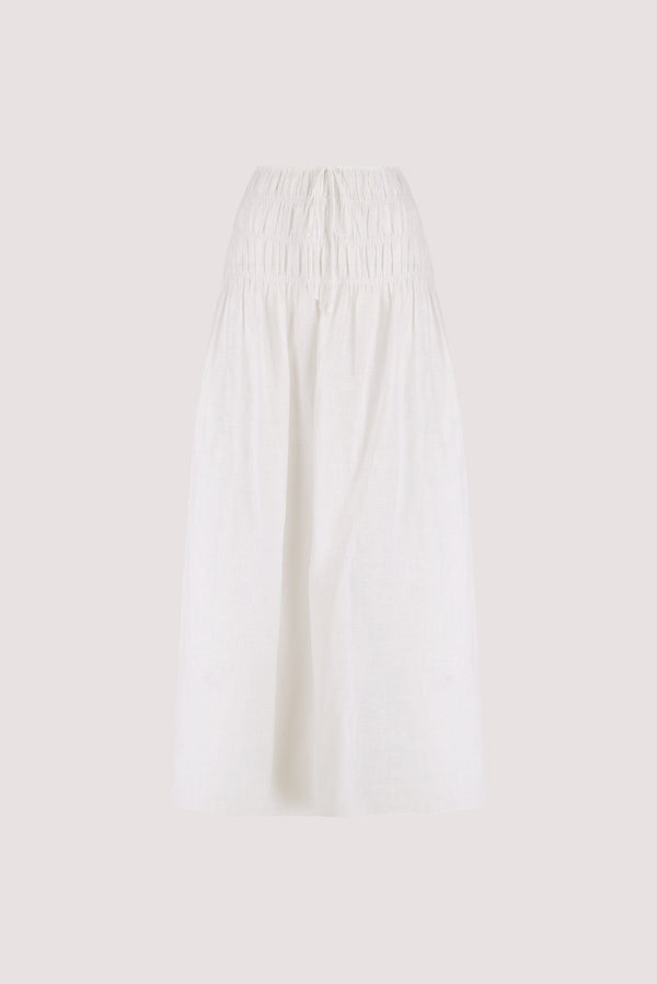 MAIA WHITE LINEN SHIRRED MIDI SKIRT