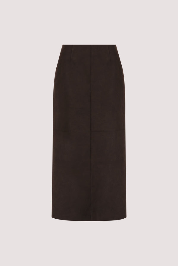 OTIS BITTER CHOC FAUX LEATHER MIDI SKIRT