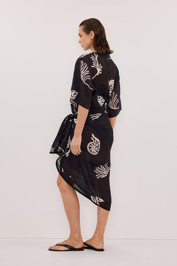 - Oversized black shell print ramie sarong