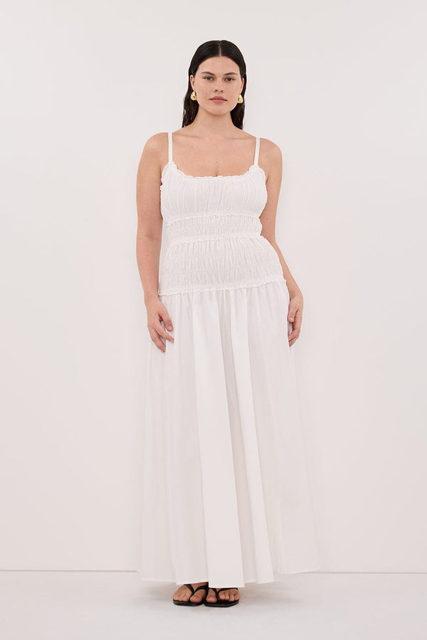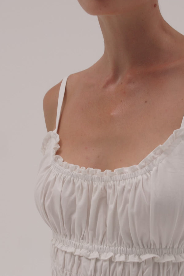 - Tiered elasticated gathering featuring easy fitting shirring through body